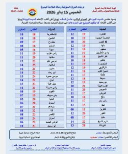 أعلنت الهيئة العامة للأرصاد الجوية تفاصيل حالة الطقس المتوقعة اليوم الخميس 15 يناير 2026، مؤكدة استمرار الانخفاض في درجات الحرارة على معظم أنحاء البلاد.