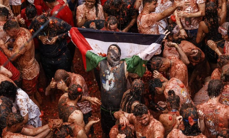 لكن مهرجان هذا العام شهد بعدا إنسانيًا لافتًا، حيث رُفعت أعلام فلسطين وسط المشاركين، في تضامن واضح مع القضية الفلسطينية. ولم يقتصر الأمر على رفع الأعلام، بل قام بعض المشاركين بوقفات احتجاجية في مسار العربات المحملة بالطماطم، مطالبين بوقف الحرب.
