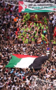لكن مهرجان هذا العام شهد بعدا إنسانيًا لافتًا، حيث رُفعت أعلام فلسطين وسط المشاركين، في تضامن واضح مع القضية الفلسطينية. ولم يقتصر الأمر على رفع الأعلام، بل قام بعض المشاركين بوقفات احتجاجية في مسار العربات المحملة بالطماطم، مطالبين بوقف الحرب.