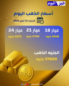 – عيار 24: سجل 5371 جنيهًا. – عيار 21: وصل إلى 4700 جنيهًا. – عيار 18: بلغ 4028 جنيهًا. – الجنيه الذهب: سجل 37600 جنيهًا. – سعر أوقية الذهب عالميًا: 3232 دولارًا.أسعار سبائك الذهب: