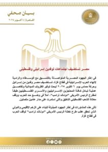 وستسضيف مصر وفدين من إسرائيل وحركة حماس يوم ٦ اكتوبر ۲۰۲٥ لبحث توفير الظروف الميدانية وتفاصيل عملية تبادل كافة المحتجزين الإسرائيليين والأسرى الفلسطينيين طبقاً المقترح الرئيس الأمريكي دونالد ترامب”، أملاً في وضع حد للحرب ووقف معاناة الشعب الفلسطيني الشقيق والتي استمرت على مدار عامين متصلين.