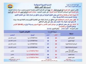 * شبورة مائية: متوقعة من الساعة 4 صباحًا حتى 8 صباحًا على بعض الطرق في شمال البلاد، القاهرة الكبرى، شمال الصعيد، مدن القناة، ووسط سيناء.